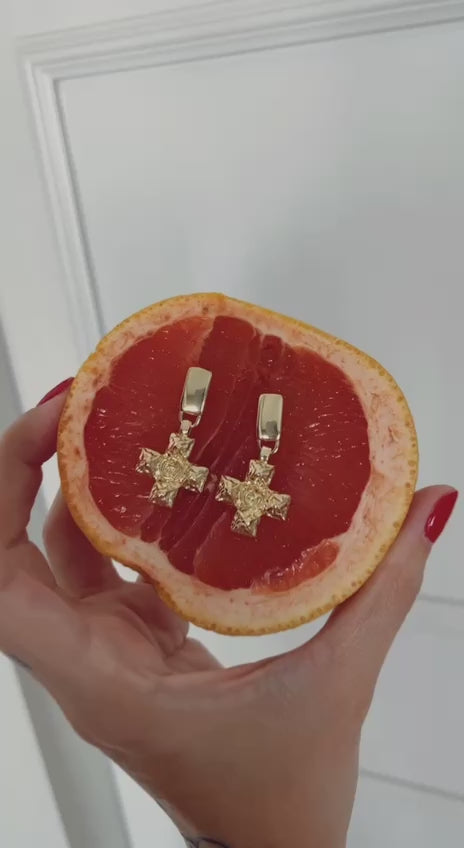 Bold and symbolic. The Elizabeth earrings feature a textured cross design with a central rose motif – crafted in gold-tone metal for a vintage-inspired, sculptural look.